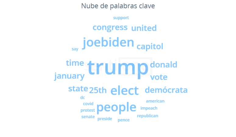 Según fue posible constatar en la gráfica de Nube de palabras clave y en la de Top Hashtags, los términos más usados sobre este tema fueron Trump, Joe Biden, Elect, People, Demócrata, United, Capitol, entre otros.