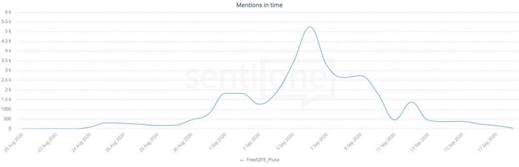 A legtöbbször egyértelműen szeptember 6-án említették a freeSZFE hashtaget, amikor az aktivisták/szimpatizánsok nagyszabású élőláncot formáltak Budapesten, és egyúttal szimpátiatüntetéseken és a Velencei Fimfesztiválon is publicitást kapott a téma.