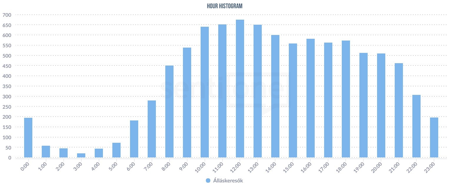 Hipotézis 2: Nahát! Tényleg a délelőtt 11 és a dél a legnépszerűbb időpont? Vajon miért? Az a bizonyos ebédszünet. Amikor egy jó tál étel mellett szabadon böngészhetjük a mobiltelefonunkat vagy anélkül keresgélhetünk új állást az irodai gépen, hogy a kollégák látnák. Ha pedig épp nincs munkánk, akkor az eredmények a későn kelés szabadságának következményeként értelmezhetők. Mivel kvalitatív kutatást most nem végeztünk erre vonatkozóan, így ez csupán egy megérzés. De korántsem légből kapott, hiszen valóságos adatok rajzolják ki az eredményt.