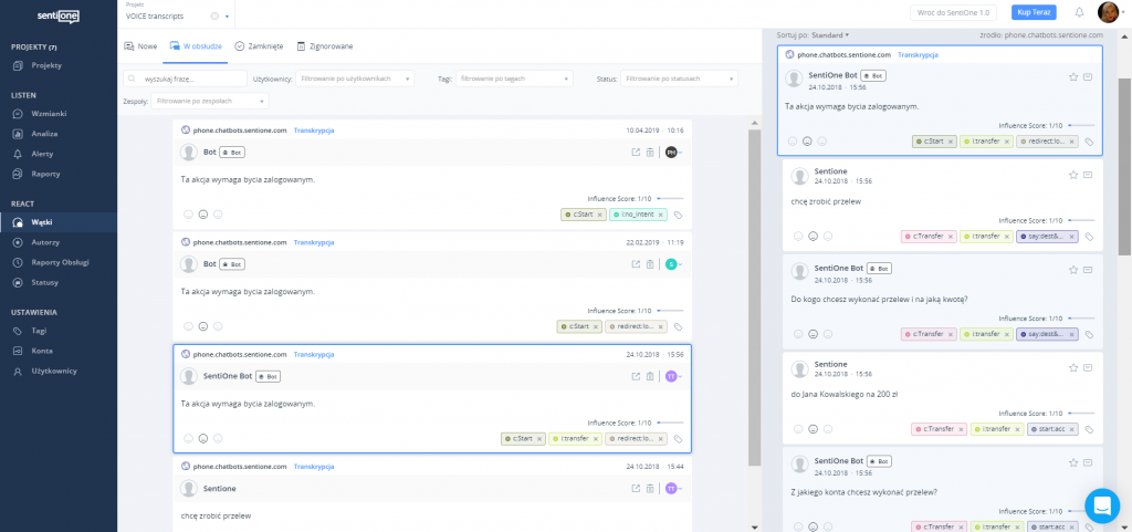 Jeśli nadal nie wiesz jakiego bota potrzebujesz, na pomoc przychodzą takie narzędzia jak SentiOne. Dzięki analizie monitoringu internetu, dowiesz się jakie problemy najczęściej zgłaszają Twoi klienci, jakie tematy rozmów powtarzają się najczęściej, jaki jest ich wolumen. Dane uzyskane z monitoringu stanowią również doskonałą bazę treningową dla bota, niezbędną do zdefiniowania procesów oraz intencji rozpoznawanych przez bota.