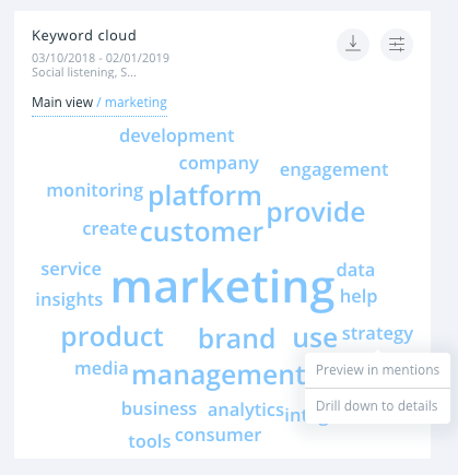 Można również zagłębić się w analizę wzmianek, klikając określone słowo. Nasza aplikacja zapyta czy chcesz sprawdzić wzmianki o tej konkretnie frazie, czy może chcesz wygenerować nową chmurę słów kluczowych dla wzmianek, które zawierają wybrane słowo.