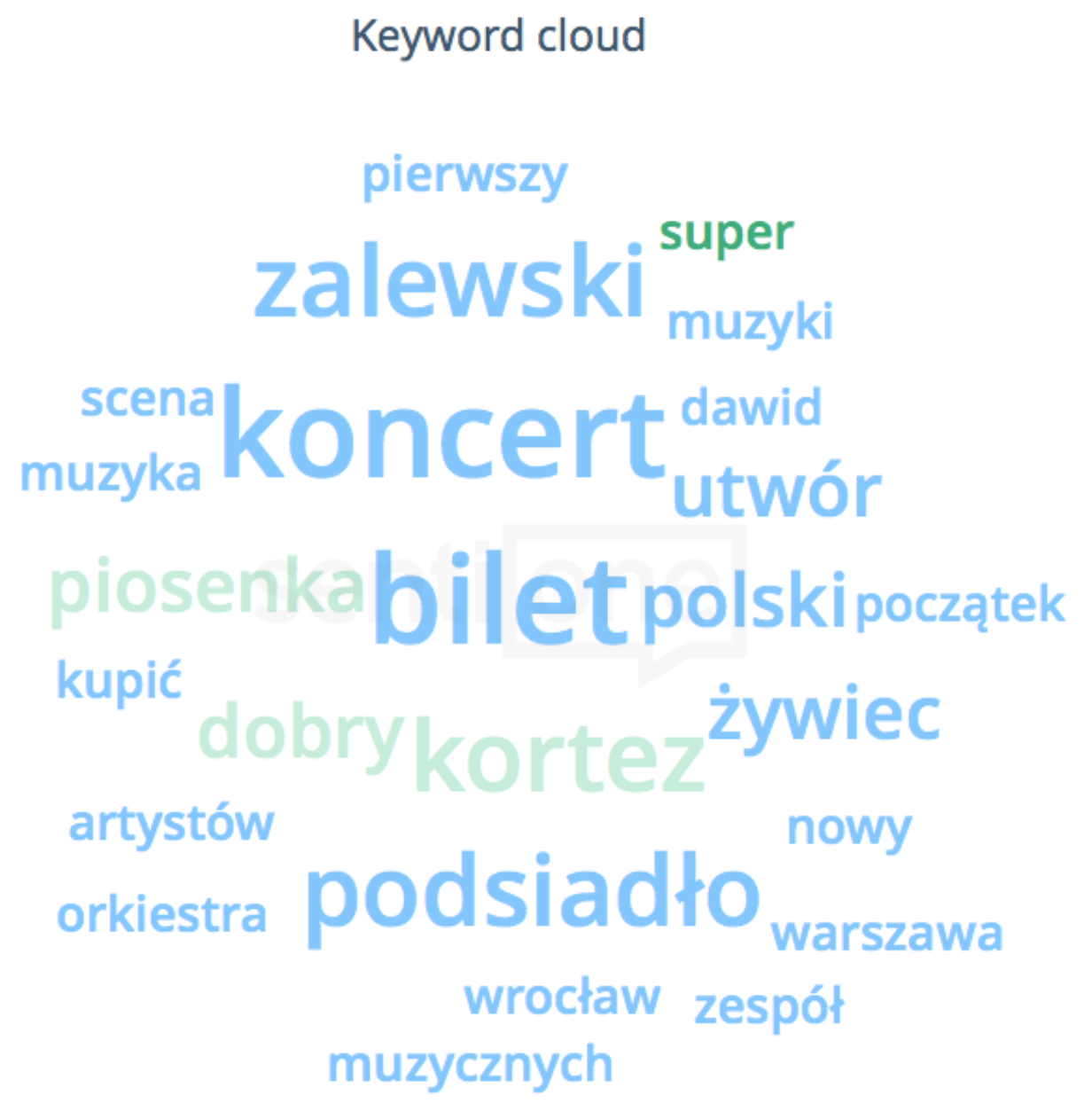 Słowa kluczowe (poniżej chmura tagów) nie pozostawiają wątpliwości! To o artystach wyrażano się najpochlebniej. Na zielono słowa o wyraźnym nacechowaniu pozytywnym, a wśród nich Kortez oraz tytuł piosenki (utworu przewodniego – Początek (https://www.youtube.com/watch?v=QRxH-II0OsA).