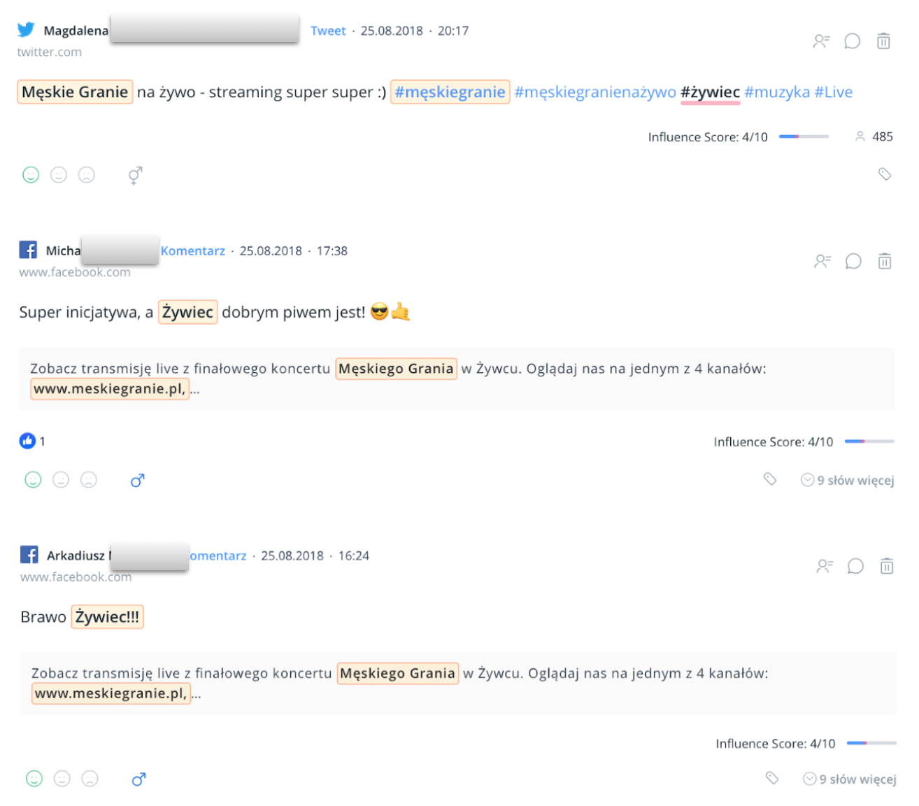 Nazwa własna marki (słowo Żywiec) występuje w sferze publicznych dyskusji online, w kontekście Męskiego Grania w blisko 70% rozmów na temat wydarzenia. Co oznacza, że cel promocyjny został w pełni osiągnięty, a konotacja Męskiego Grania z Żywcem jest dla internautów oczywista. Można to zauważyć przeglądając liczne komentarze internautów, na przykład: