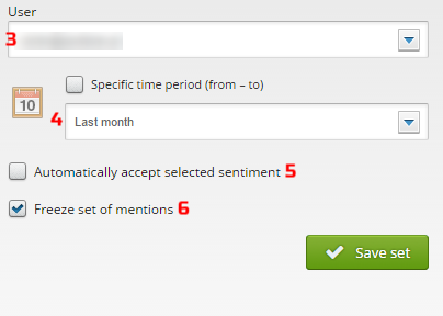 • if you decide to tick the “Freeze set of mentions” option (6), new mentions will not be added to the set after they are detected by SentiOne. To rate mentions detected after creating the set you will have to create a new one.