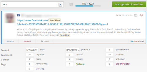 Upon selection of set for rating, one mention appears in a big box at a time. Below the mention a “button legend” is displayed. Mentions can be promptly rated with the keyboard (no need to use the mouse):
