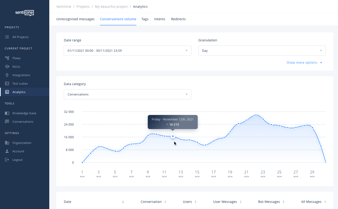 Puede usar varios filtros para, por ejemplo, comprobar el número de conversaciones sobre un tema determinado. Muestre todos los datos en una tabla o gráfica para poder interpretar los resultados fácilmente.