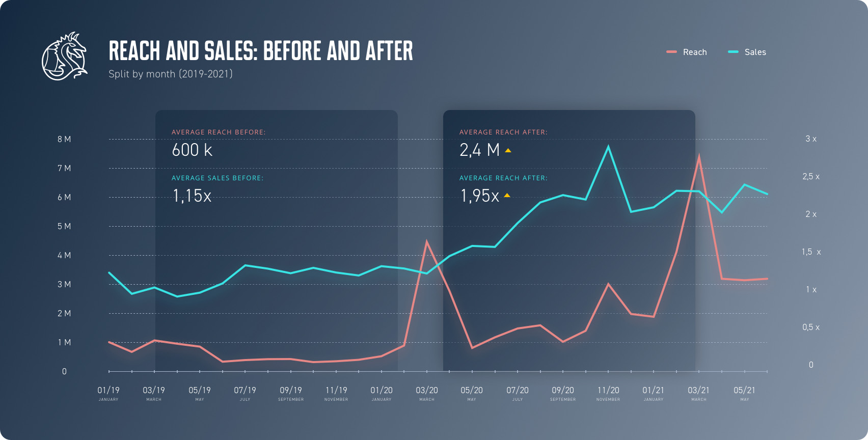 The effectiveness of focusing on reach, introducing 4dx and constant efficacy monitoring was immediately obvious. Comparing the 12 months before implementing the new work methodology and the 12 months afterwards we noted an average monthly reach growth of 300% and an average sales growth of 70%.